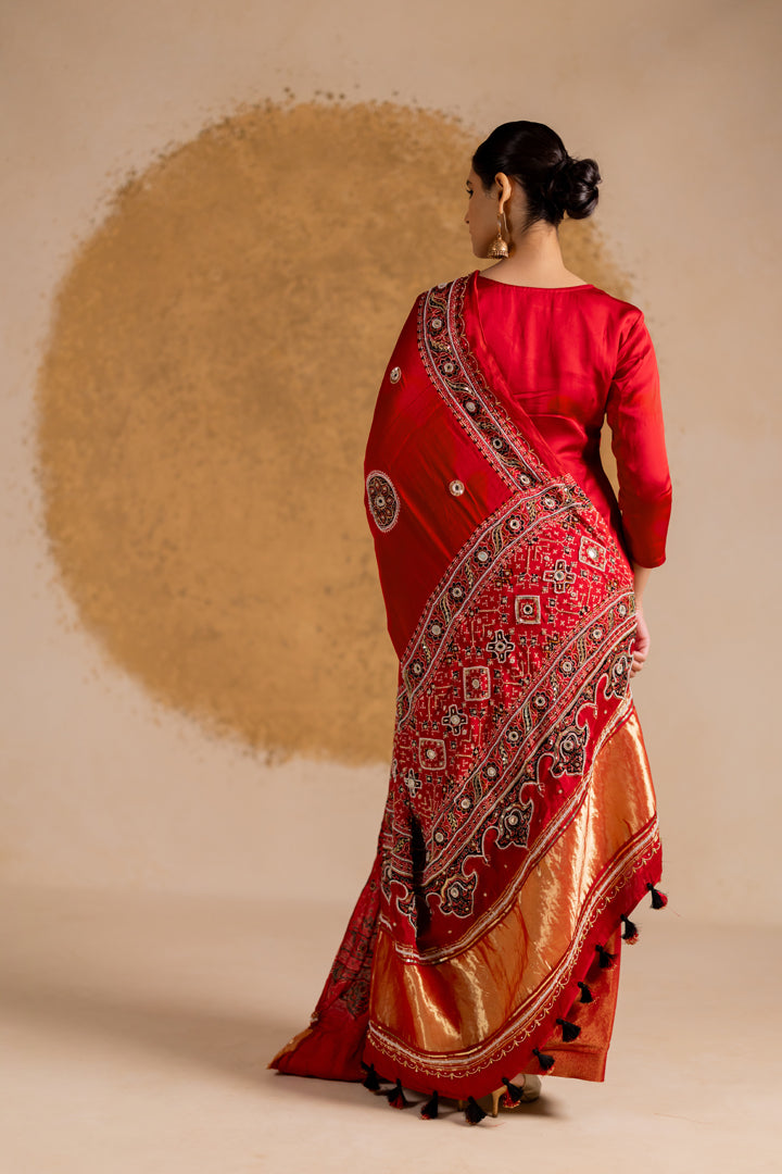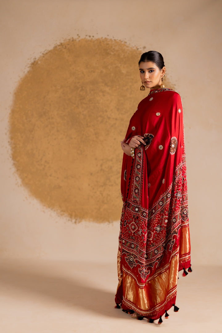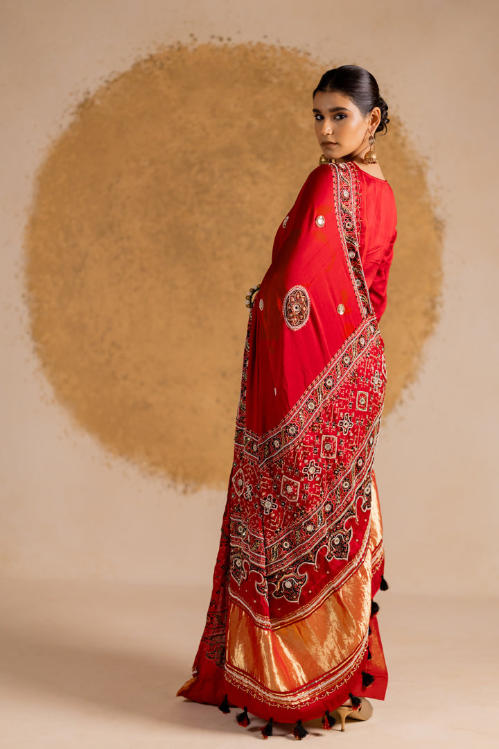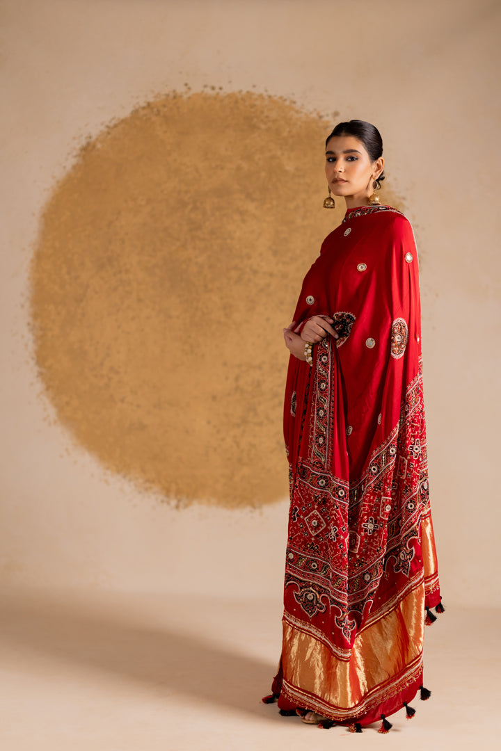 A statement Ajrakh Bandhani ensemble that beautifully blends two heritage crafts — Ajrakh detailing on the sides with rich Bandhani work in the center. Each piece is handcrafted and designed to stand out.