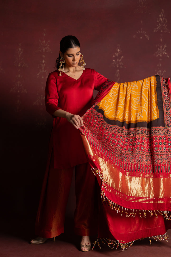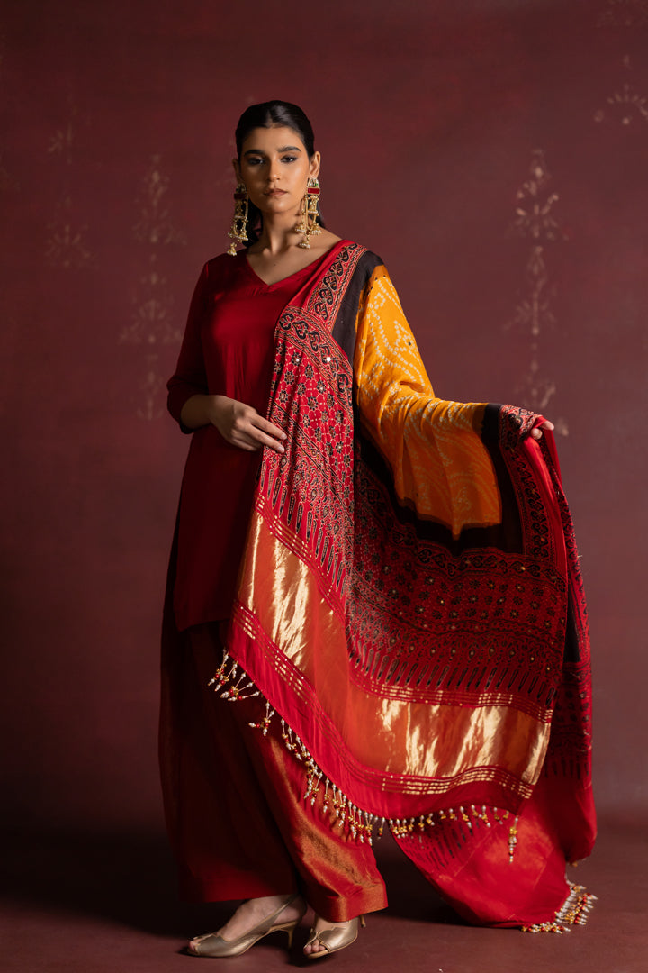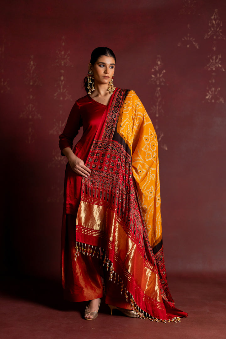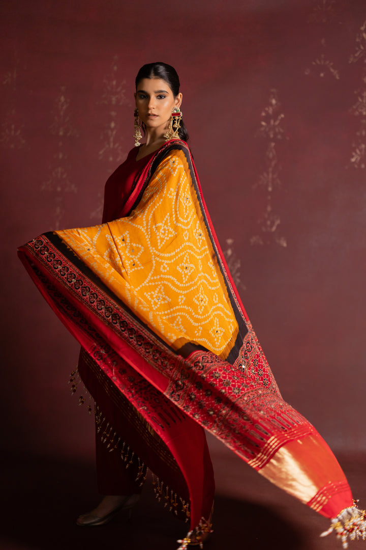 Ajrakh Bandhani Dupatta Suit Set Madder Red & Turmeric Yellow