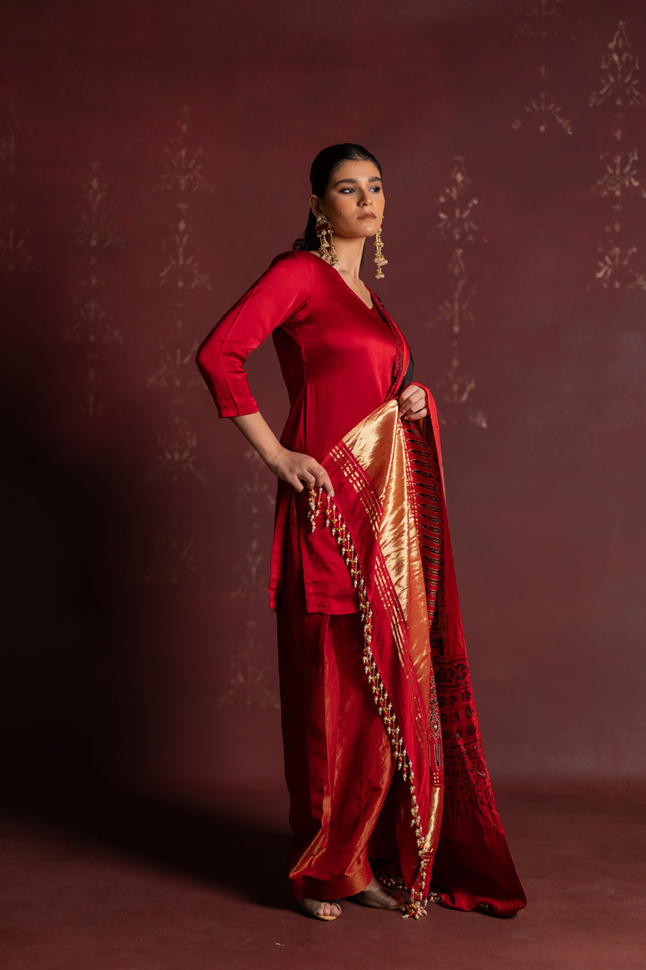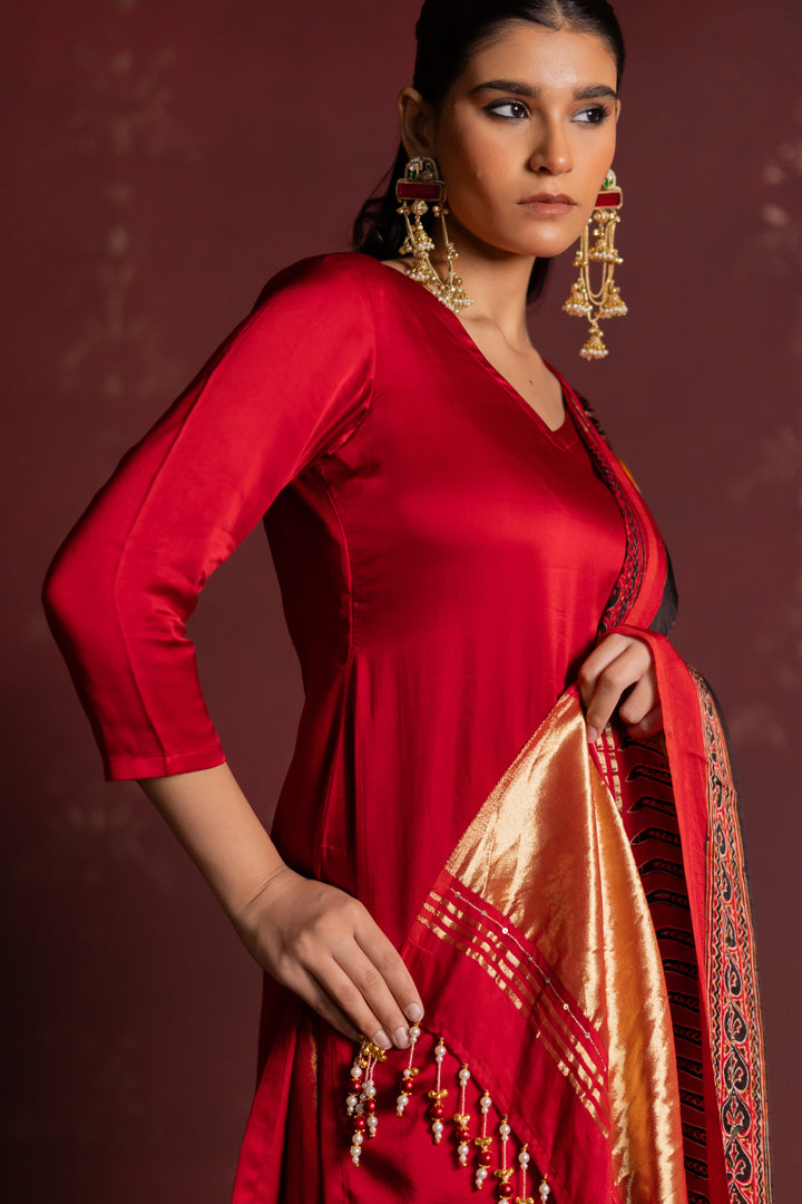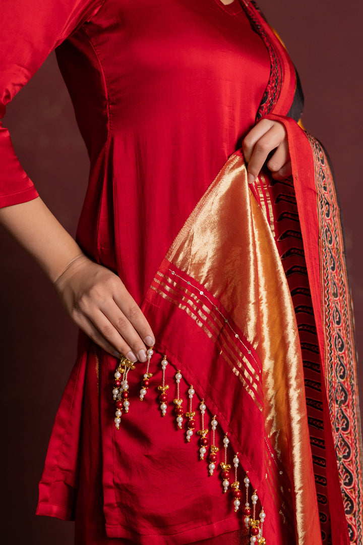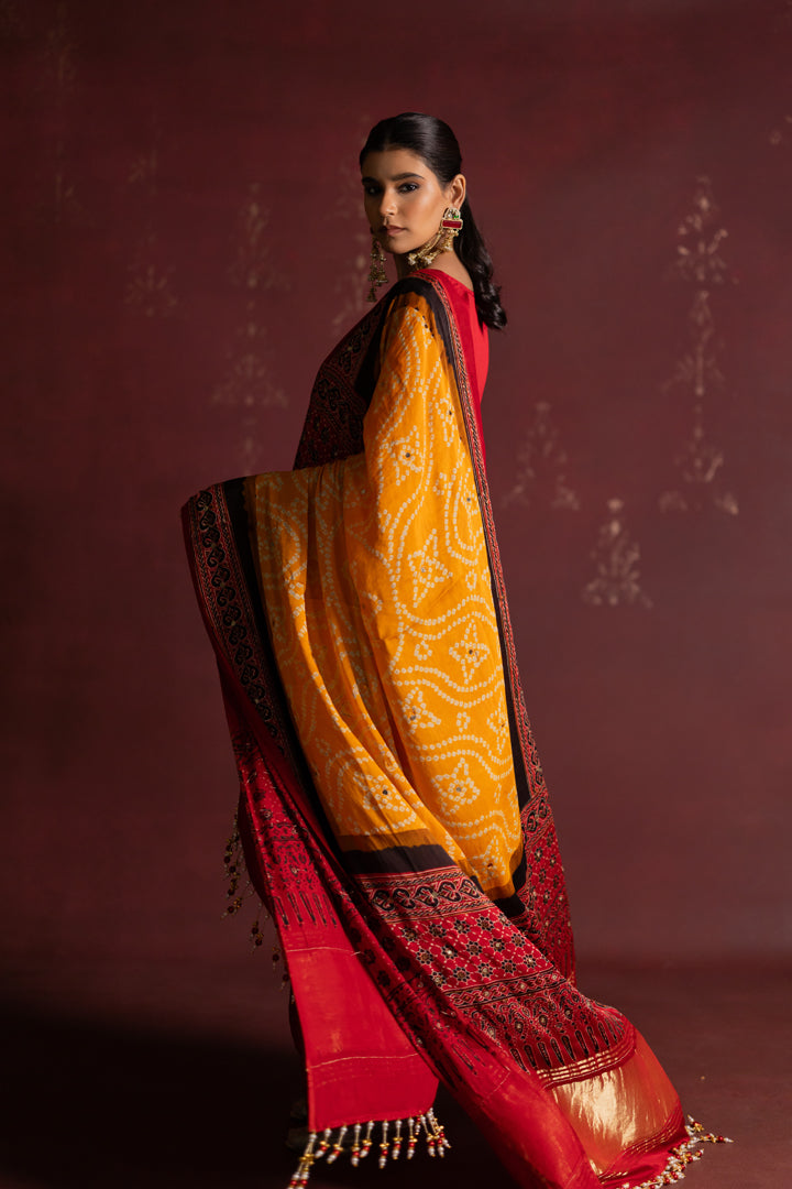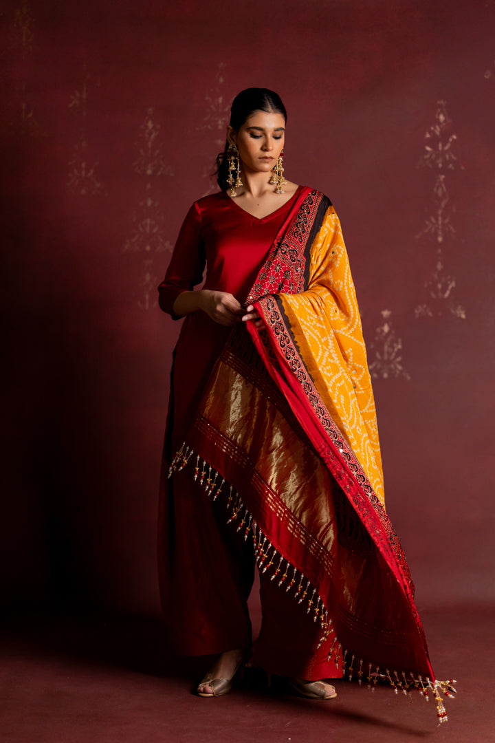 Ajrakh Bandhani Dupatta Suit Set Madder Red & Turmeric Yellow