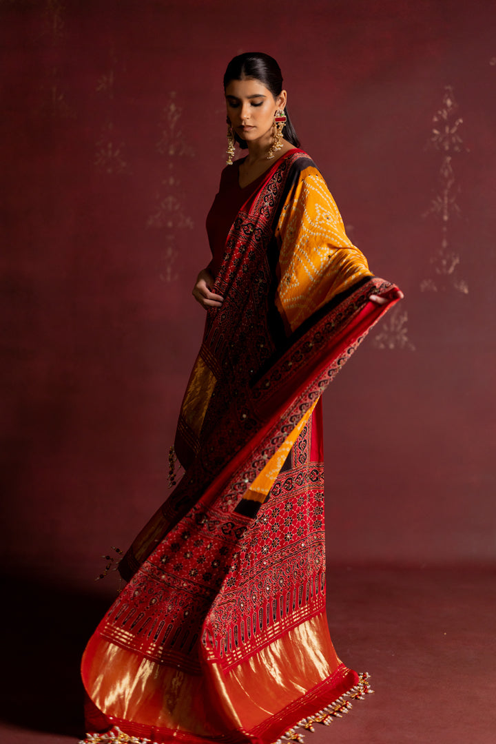 A statement Ajrakh Bandhani ensemble that beautifully blends two heritage crafts — Ajrakh detailing on the sides with rich Bandhani work in the center. Each piece is handcrafted and designed to stand out.