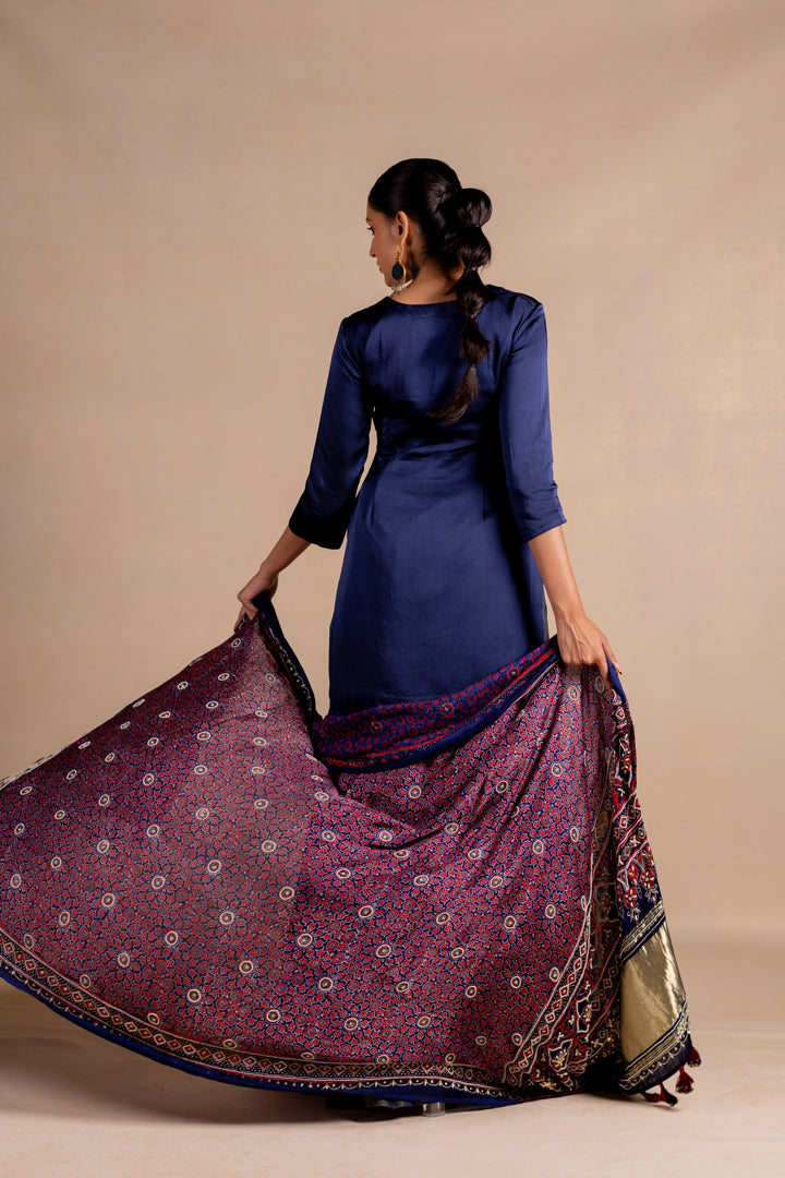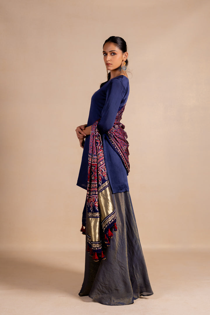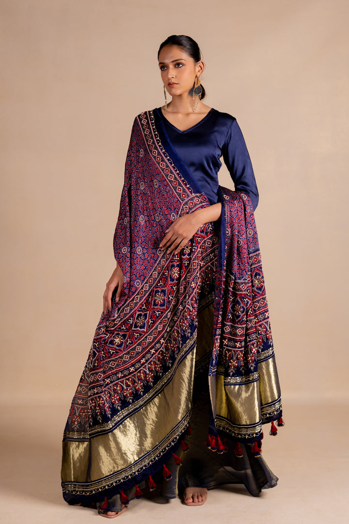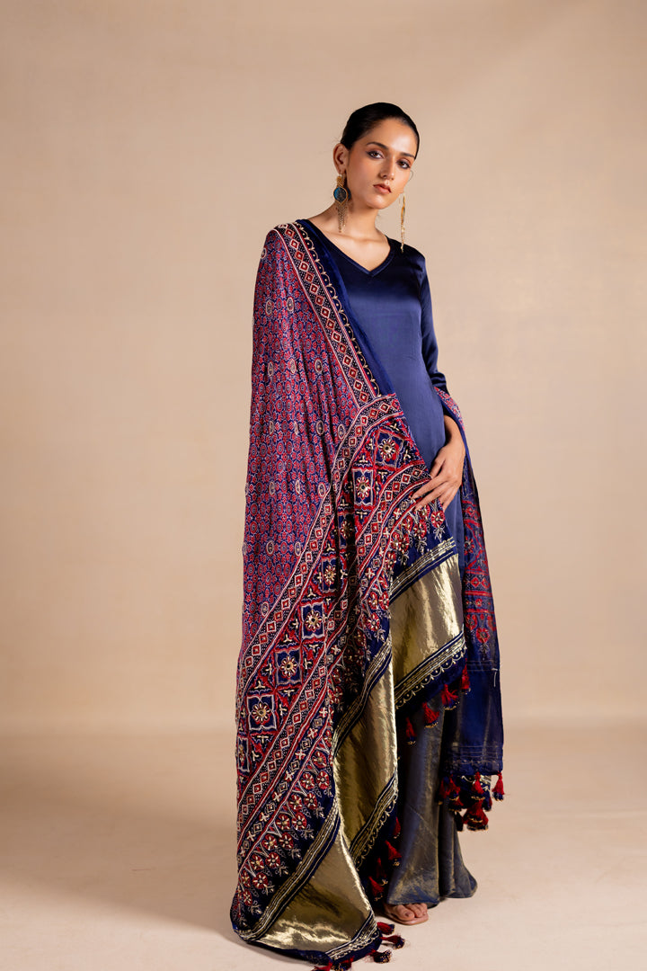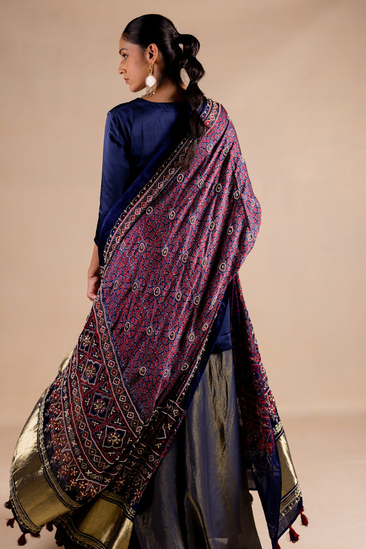 A stunning handcrafted Ajrakh ensemble, beautifully hand embroidered and finished with intricate tassel details. Each piece celebrates heritage craftsmanship while offering a modern, wearable silhouette.