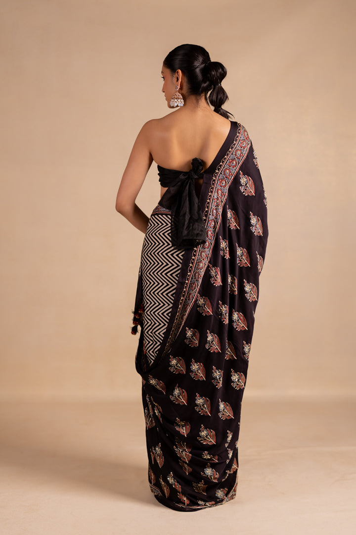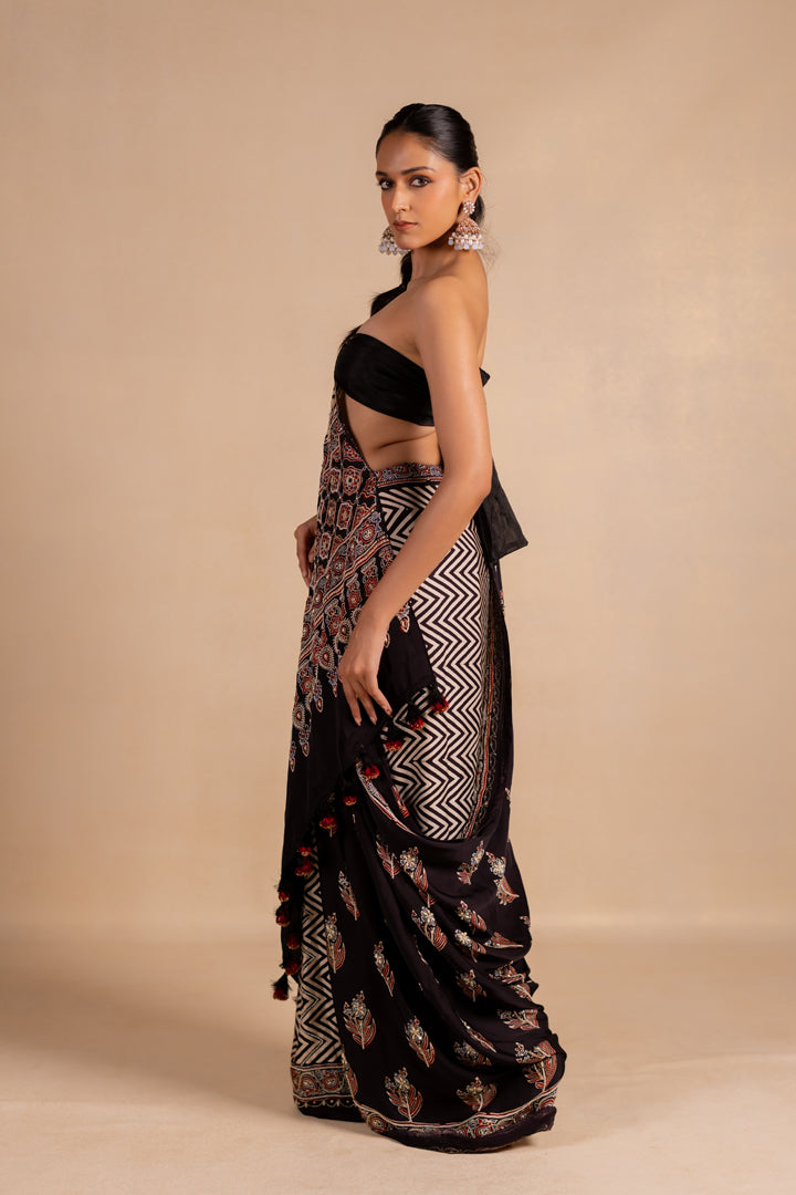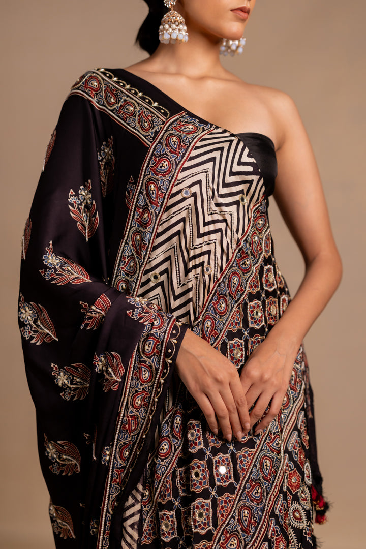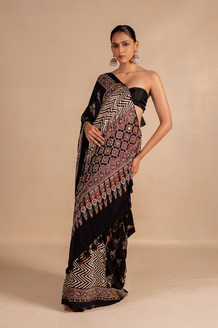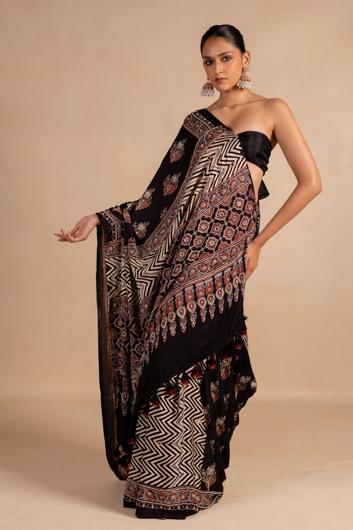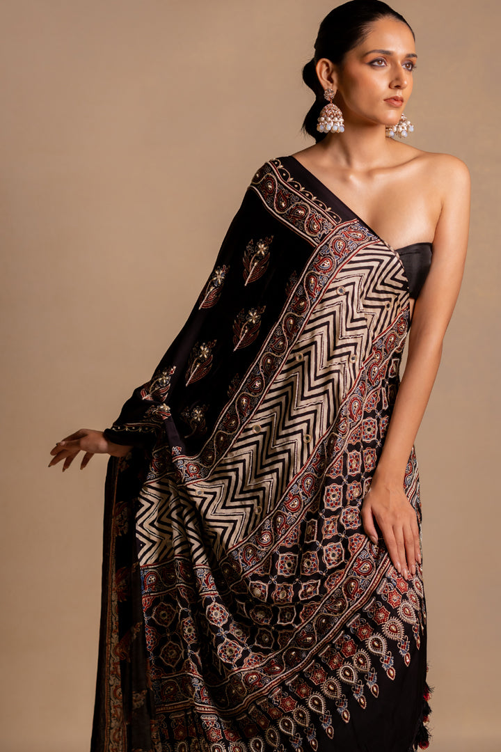 A limited edition Ajrakh saree crafted in luxurious modal silk, adorned with traditional hand block prints and delicate hand embroidery. Each piece is a true work of art, celebrating timeless heritage craftsmanship with a contemporary touch.