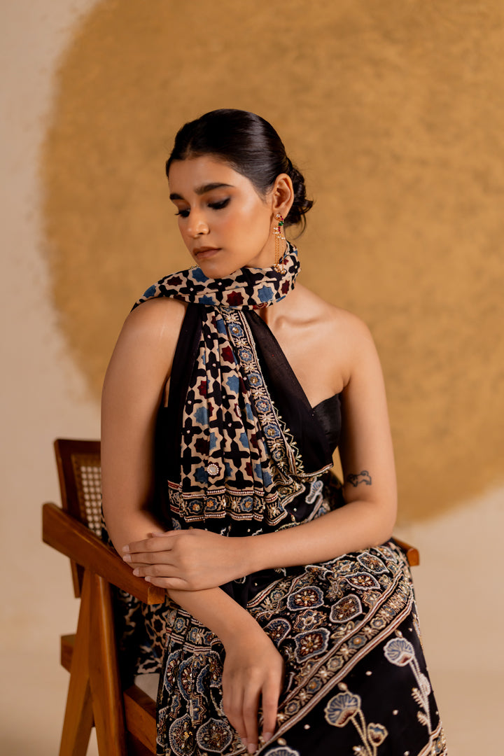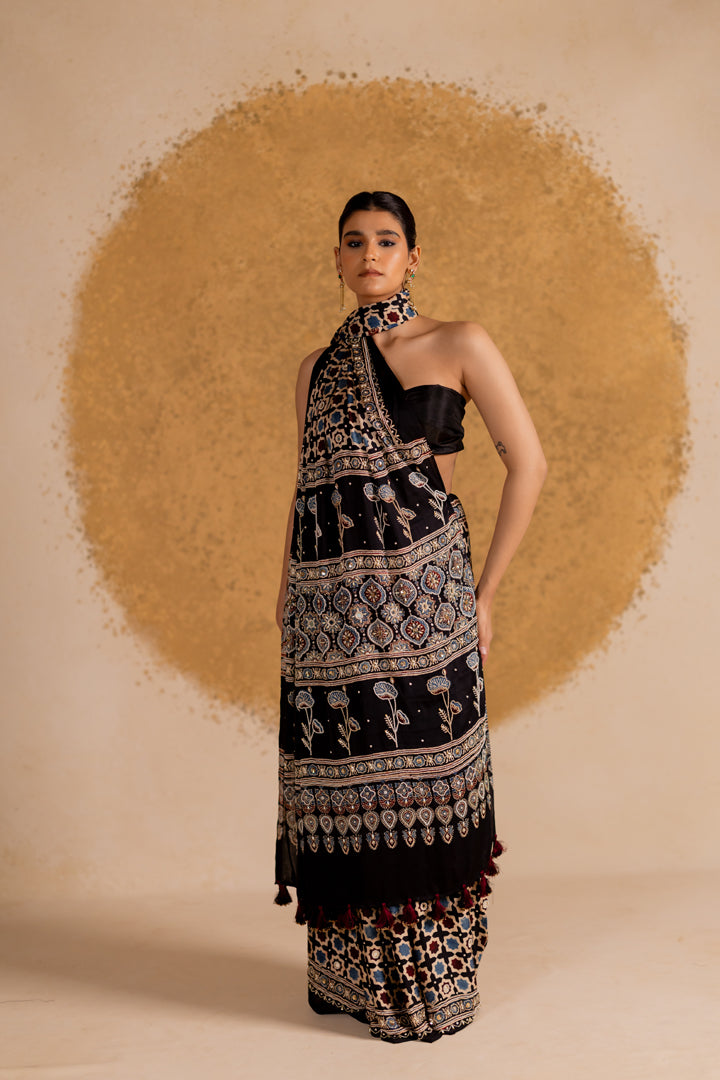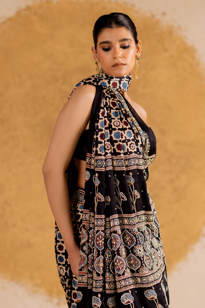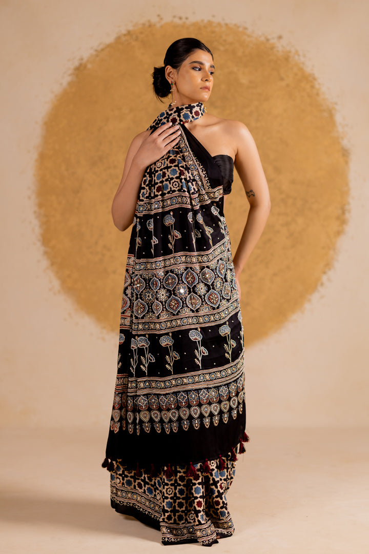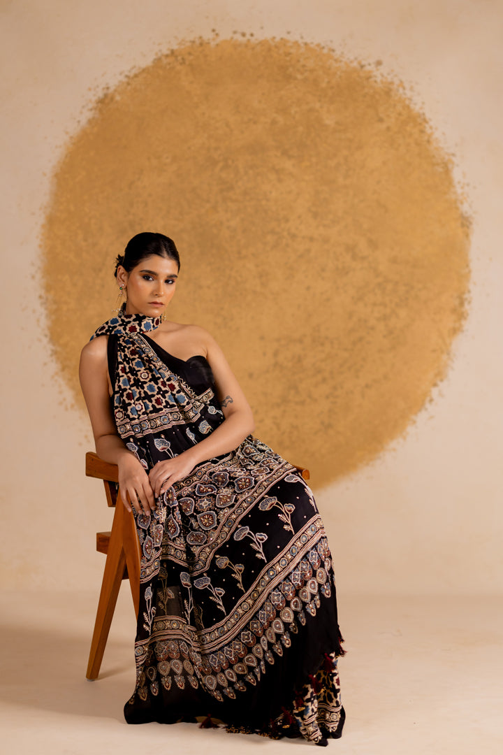 A limited edition Ajrakh saree crafted in luxurious modal silk, adorned with traditional hand block prints and delicate hand embroidery. Each piece is a true work of art, celebrating timeless heritage craftsmanship with a contemporary touch.