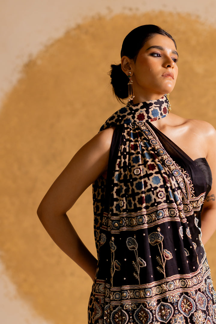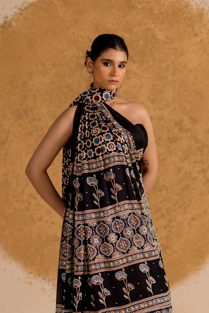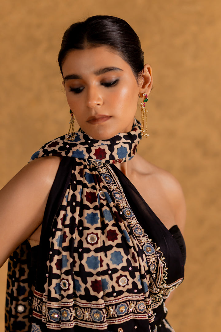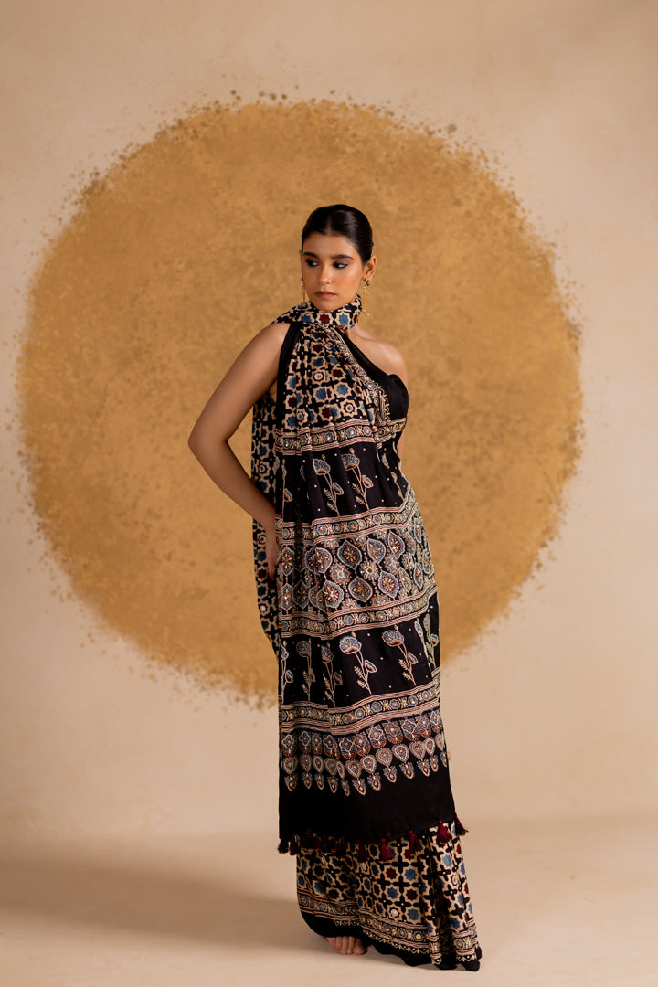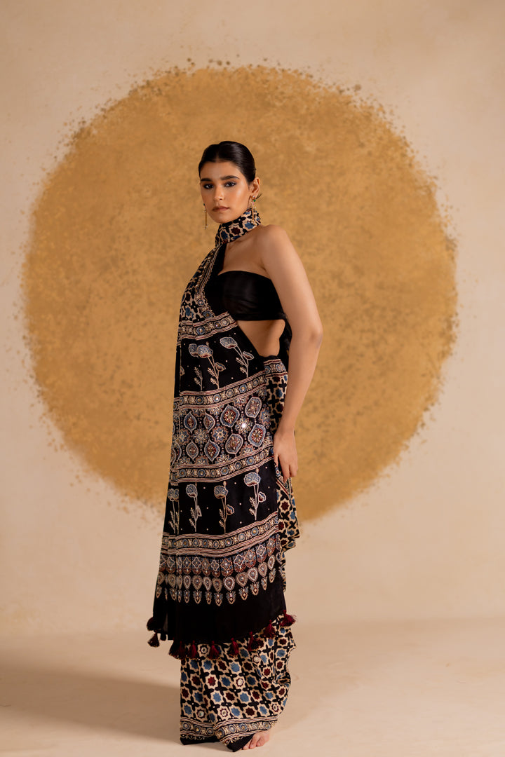 A limited edition Ajrakh saree crafted in luxurious modal silk, adorned with traditional hand block prints and delicate hand embroidery. Each piece is a true work of art, celebrating timeless heritage craftsmanship with a contemporary touch.
