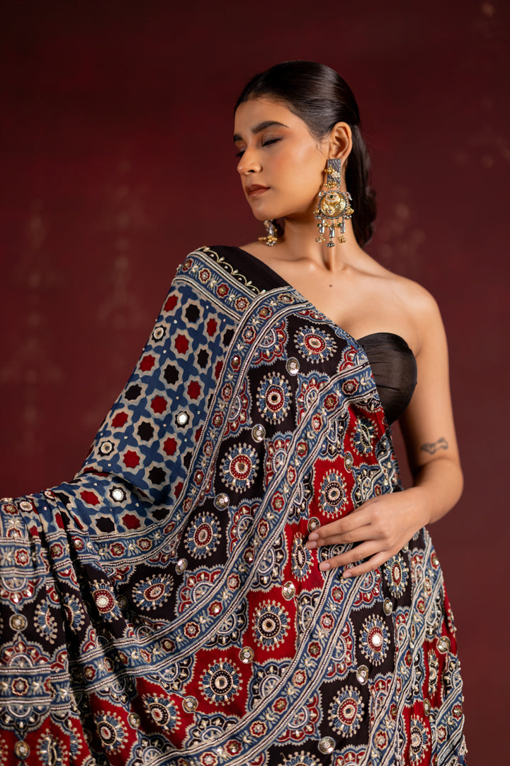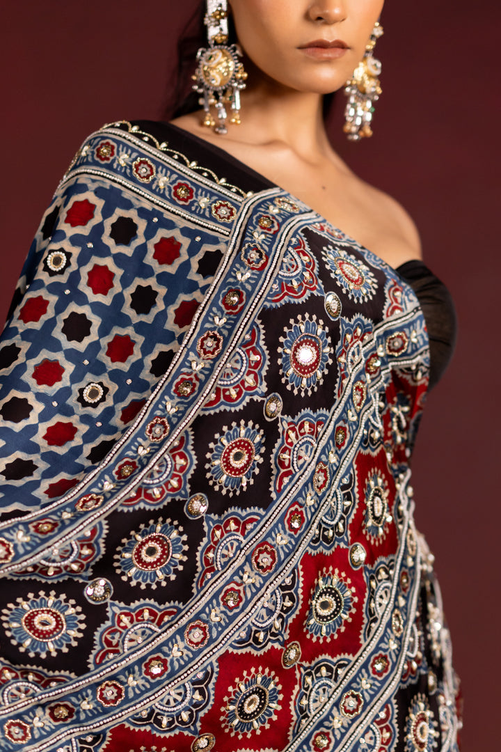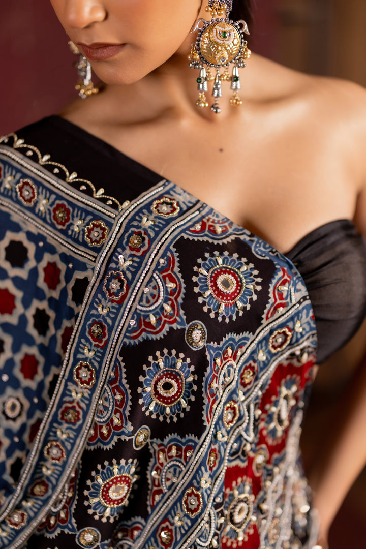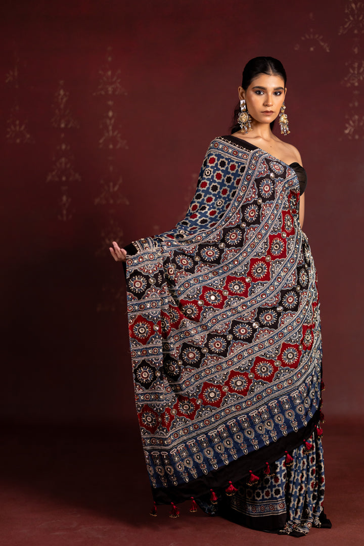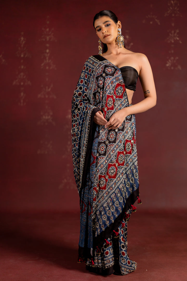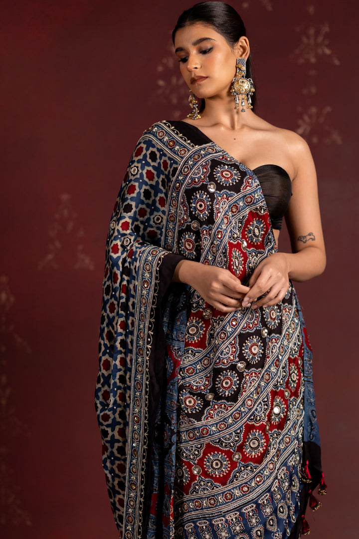 A limited edition Ajrakh saree crafted in luxurious modal silk, adorned with traditional hand block prints and delicate hand embroidery. Each piece is a true work of art, celebrating timeless heritage craftsmanship with a contemporary touch.
