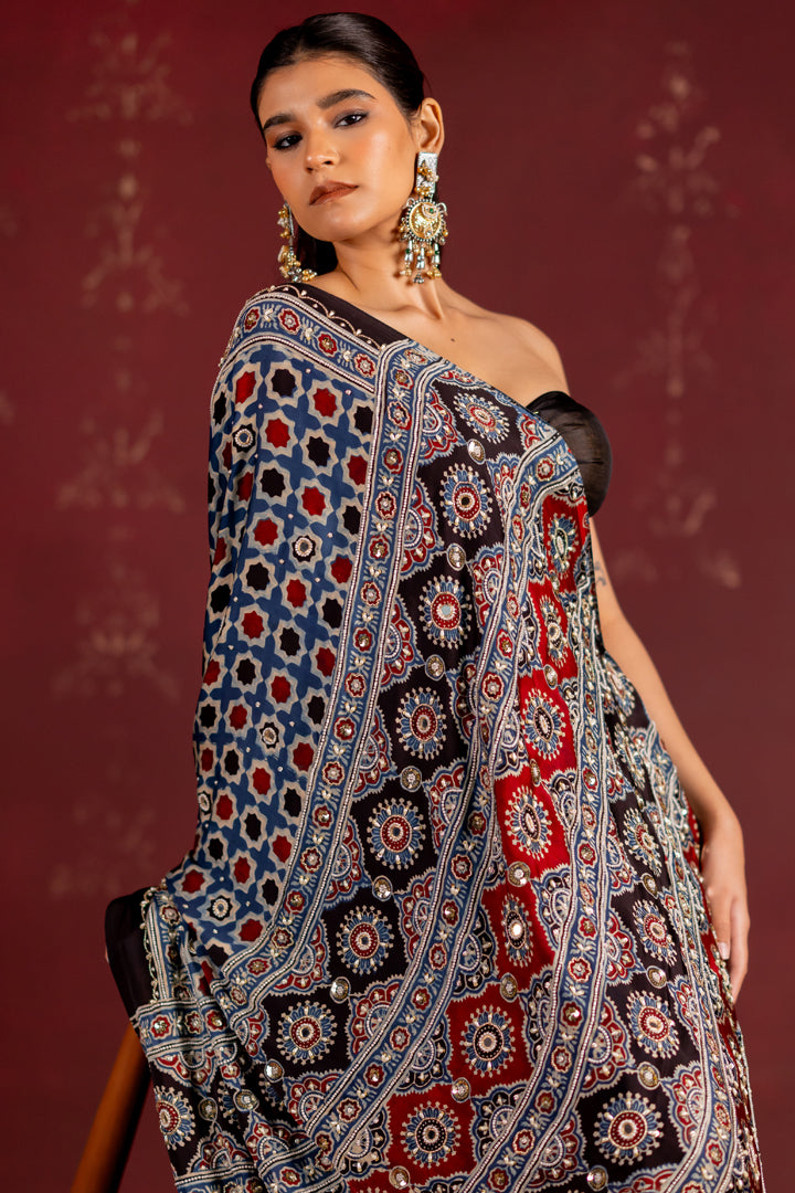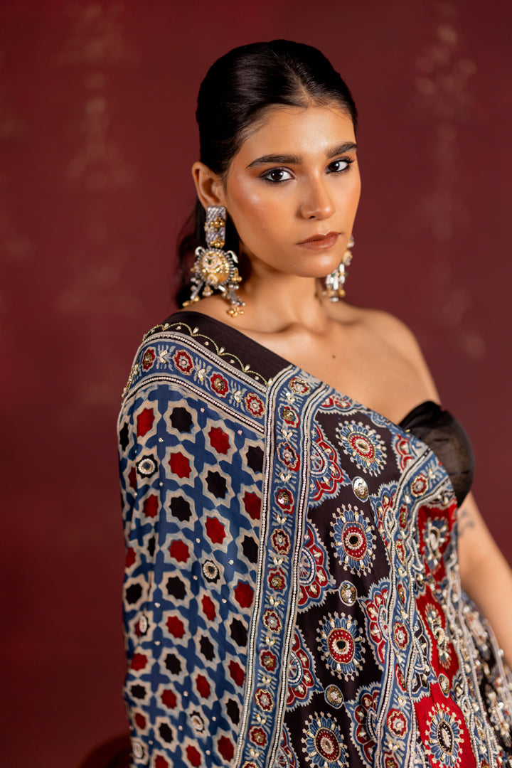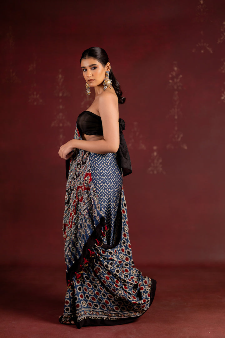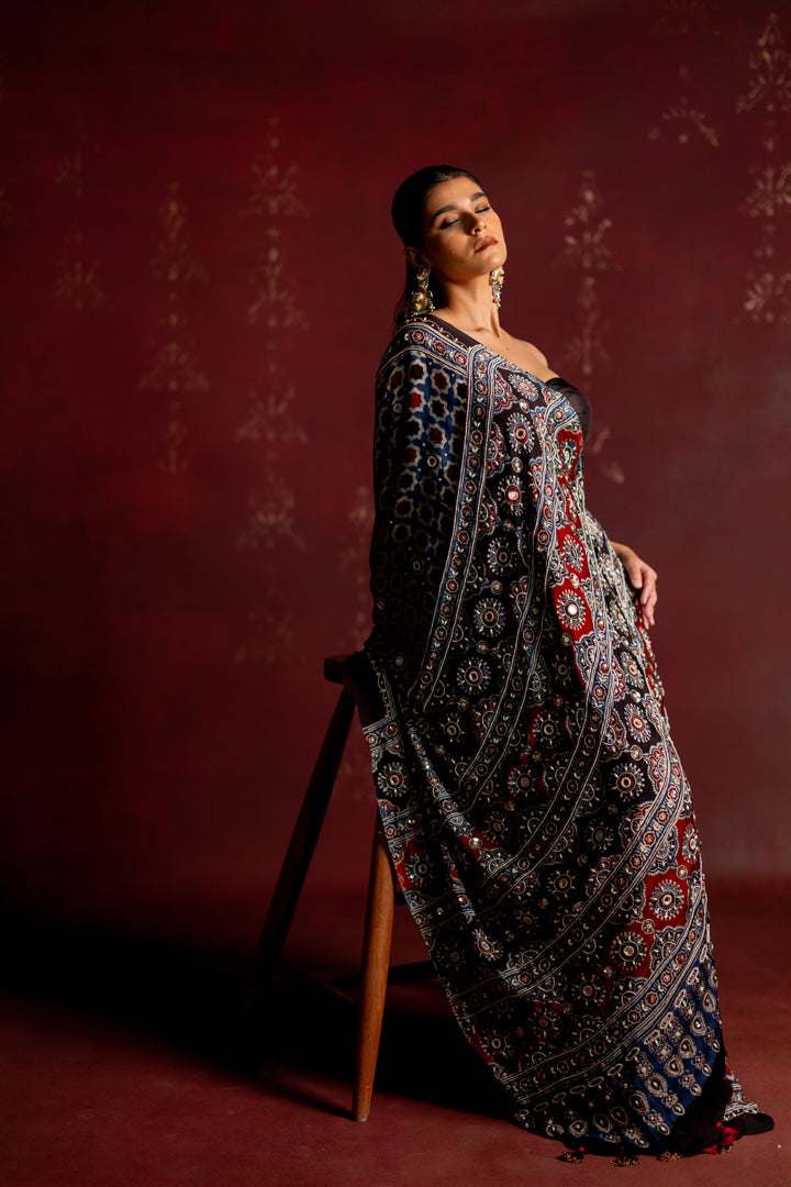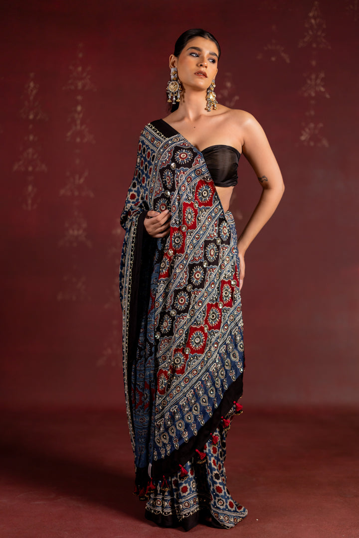A limited edition Ajrakh saree crafted in luxurious modal silk, adorned with traditional hand block prints and delicate hand embroidery. Each piece is a true work of art, celebrating timeless heritage craftsmanship with a contemporary touch.