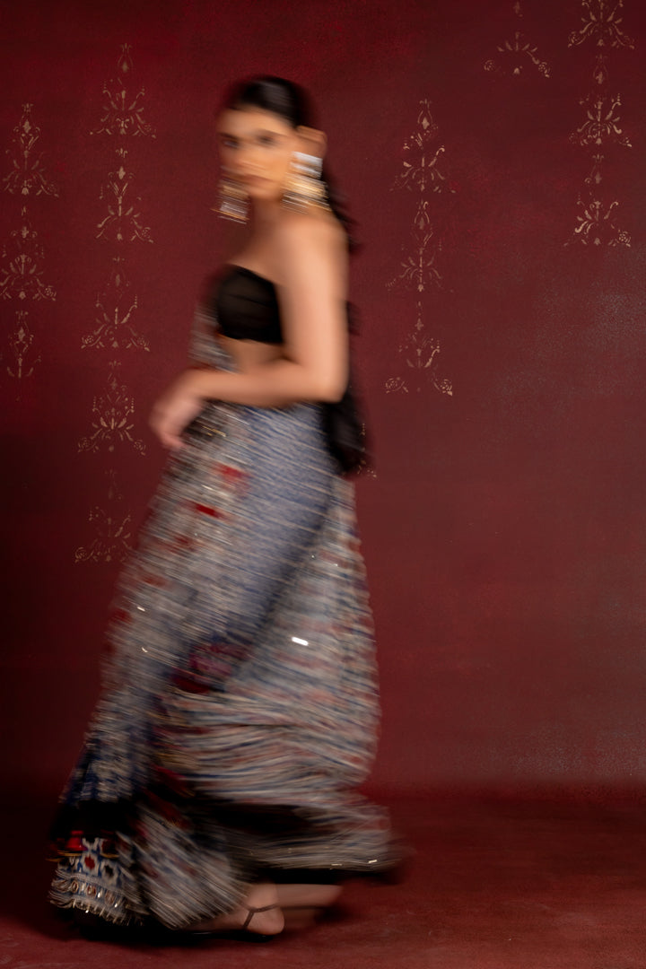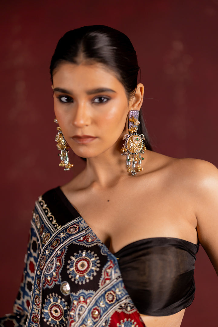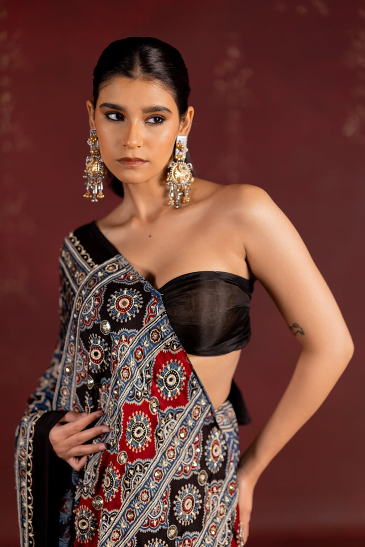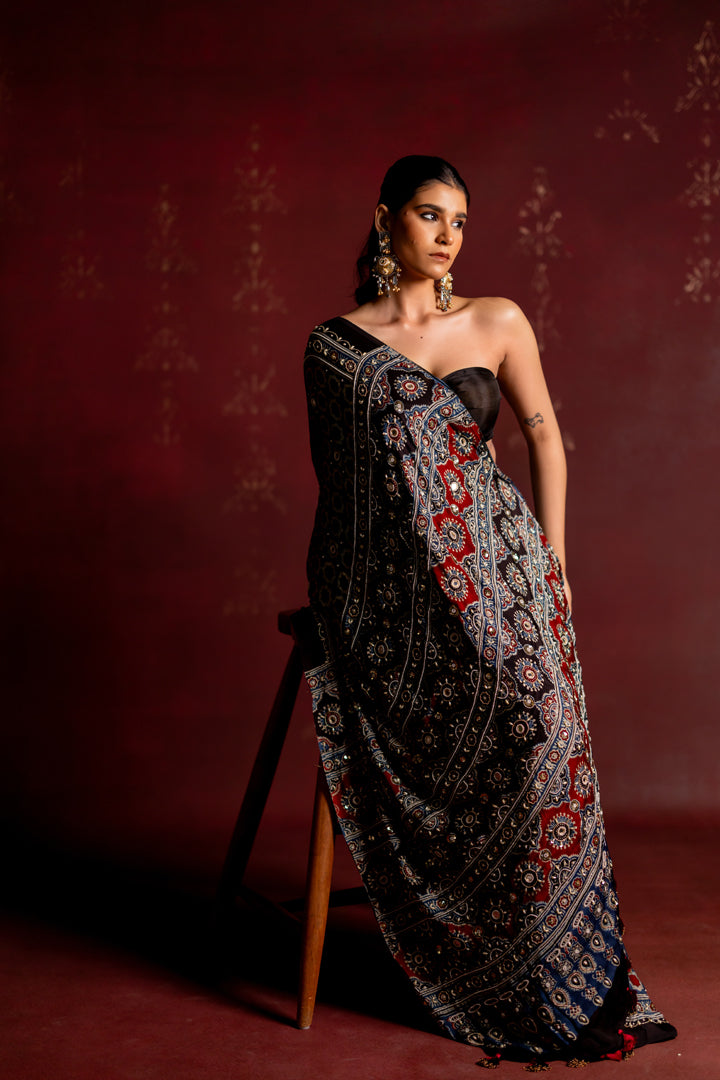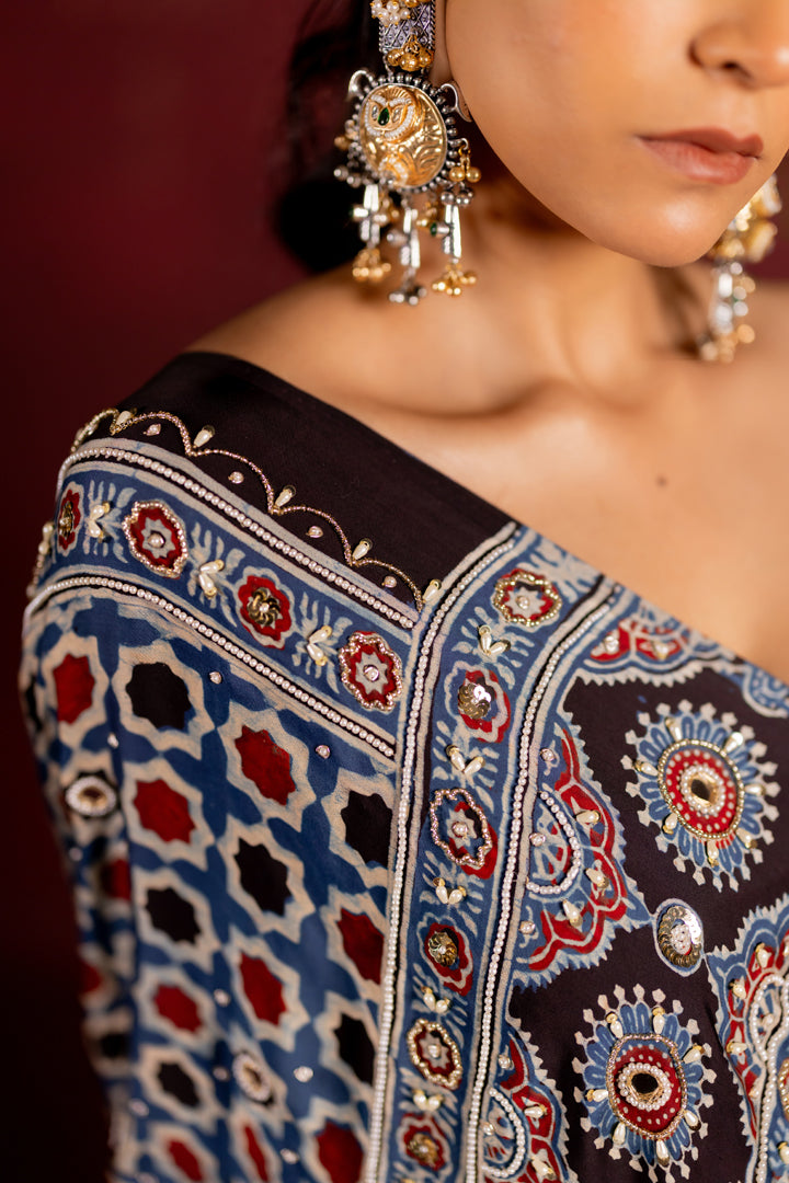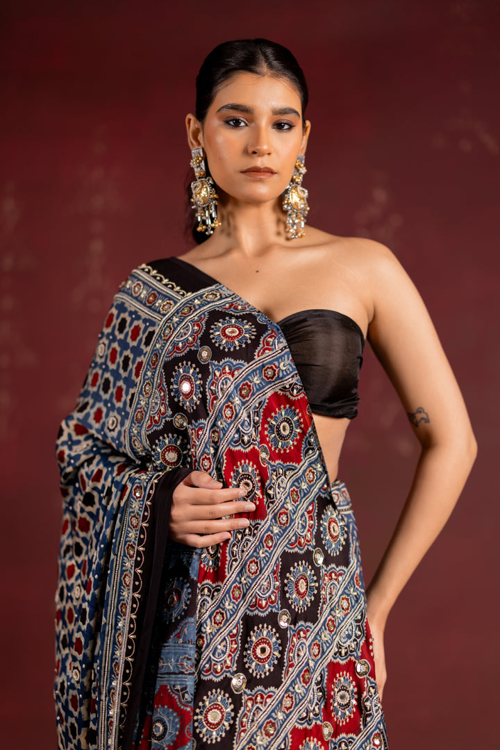 A limited edition Ajrakh saree crafted in luxurious modal silk, adorned with traditional hand block prints and delicate hand embroidery. Each piece is a true work of art, celebrating timeless heritage craftsmanship with a contemporary touch.