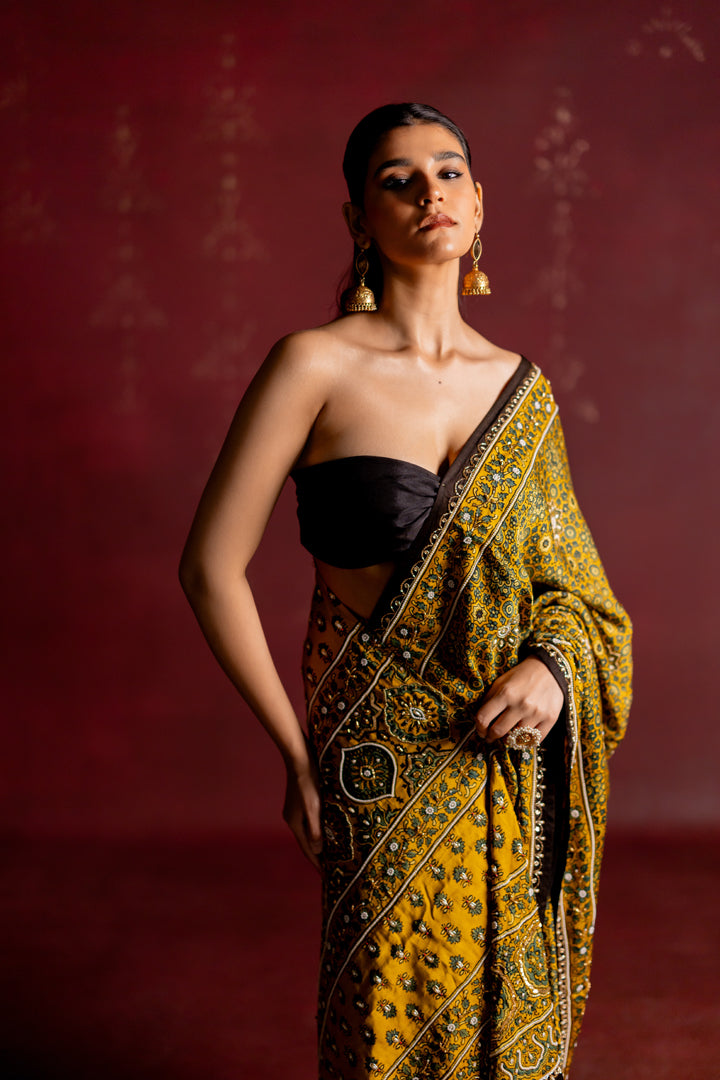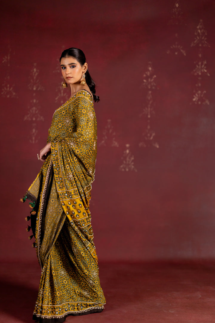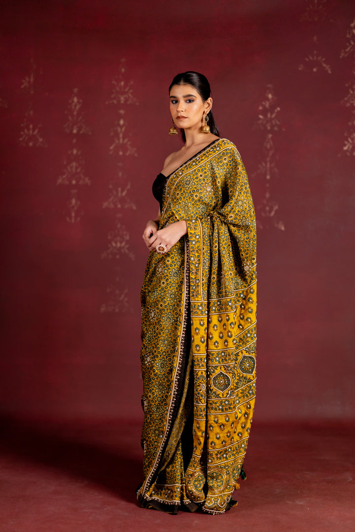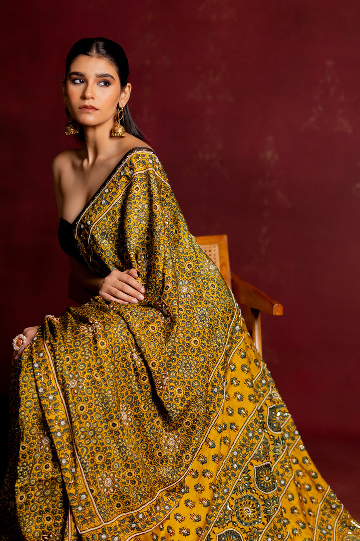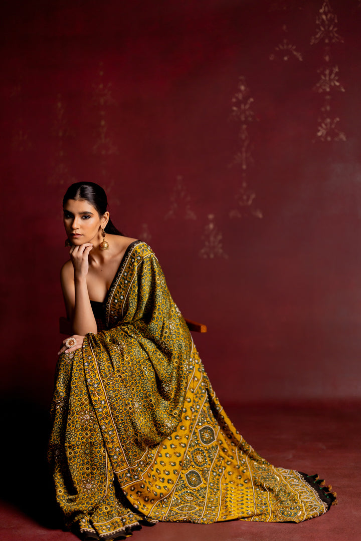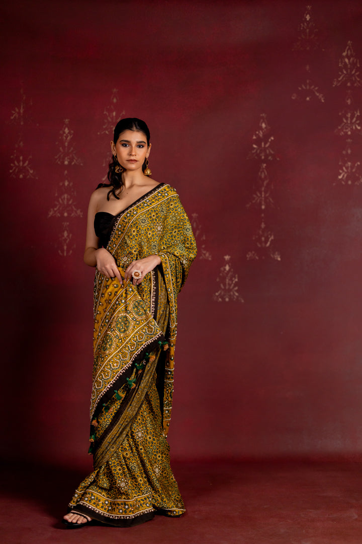 A limited edition Ajrakh saree crafted in luxurious modal silk, adorned with traditional hand block prints and delicate hand embroidery. Each piece is a true work of art, celebrating timeless heritage craftsmanship with a contemporary touch.