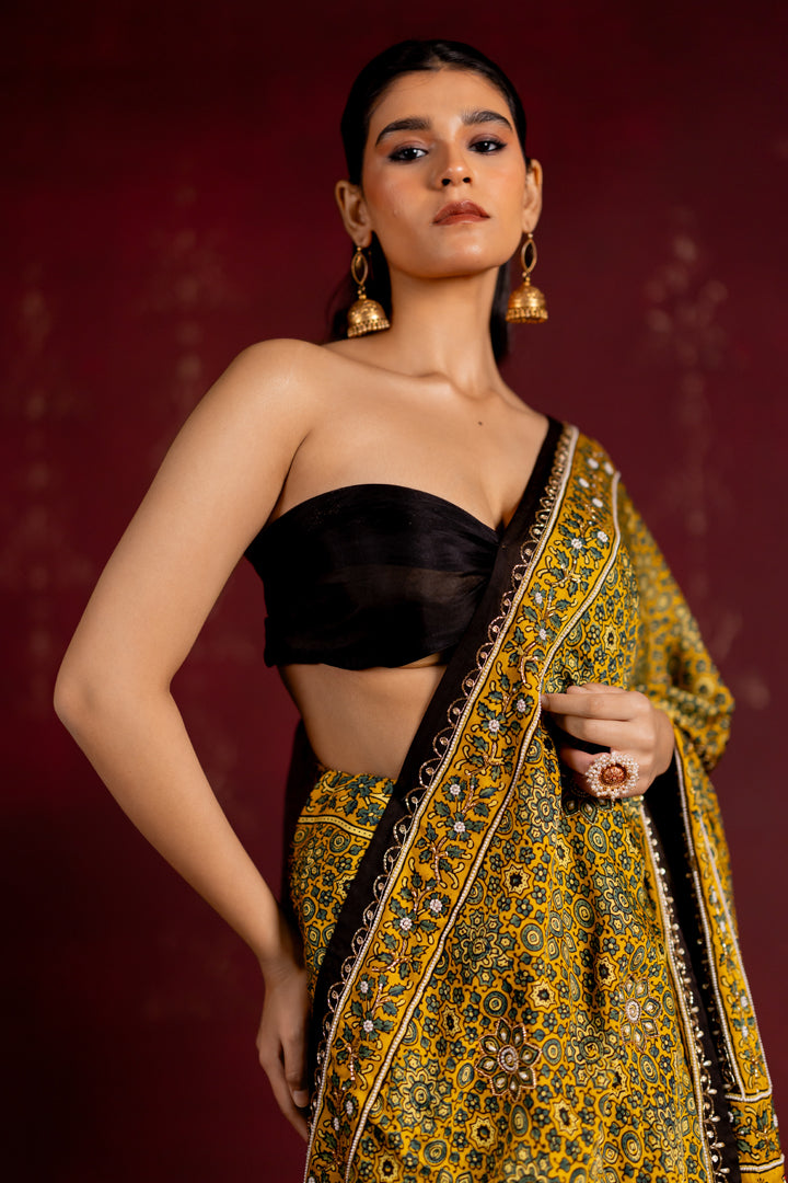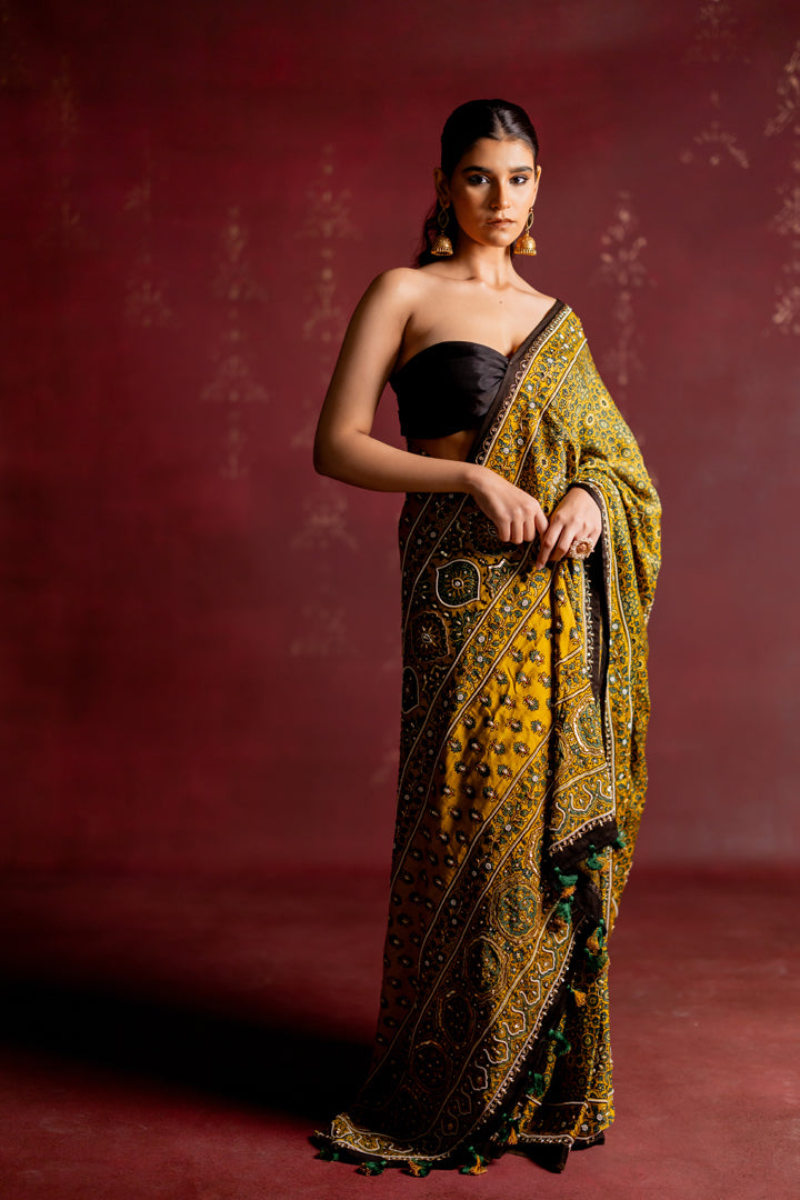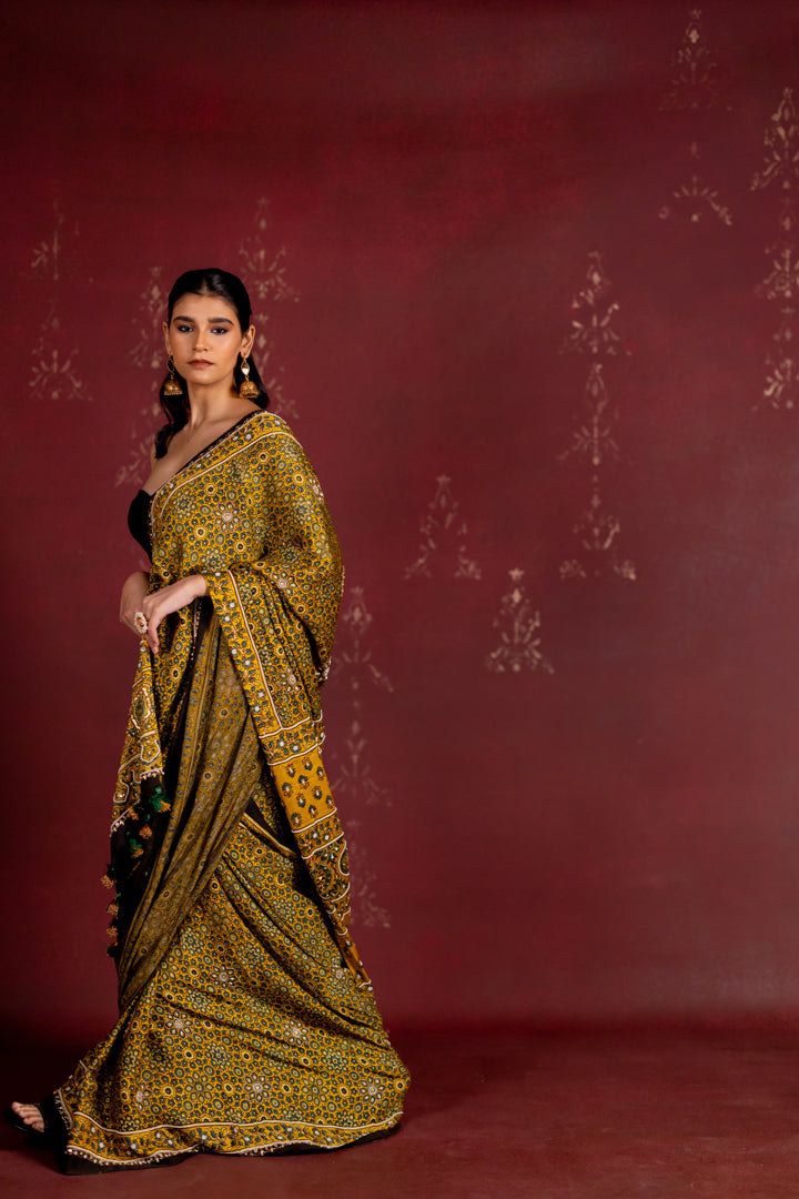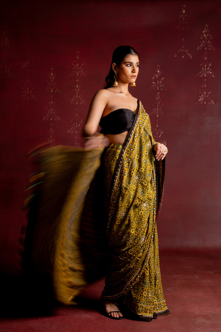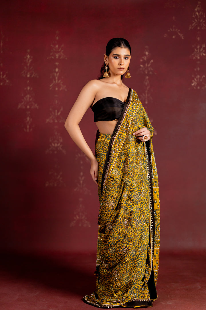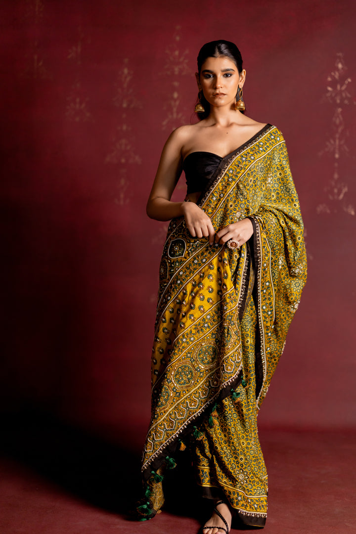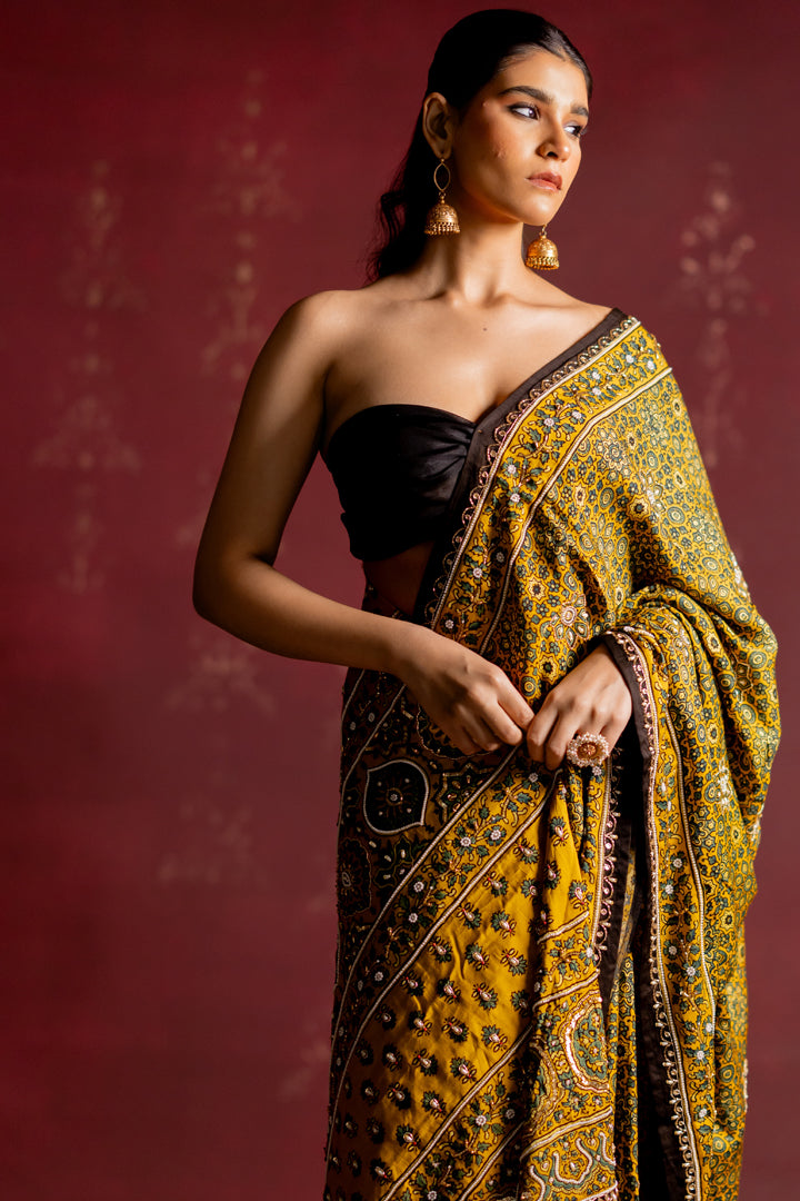 A limited edition Ajrakh saree crafted in luxurious modal silk, adorned with traditional hand block prints and delicate hand embroidery. Each piece is a true work of art, celebrating timeless heritage craftsmanship with a contemporary touch.