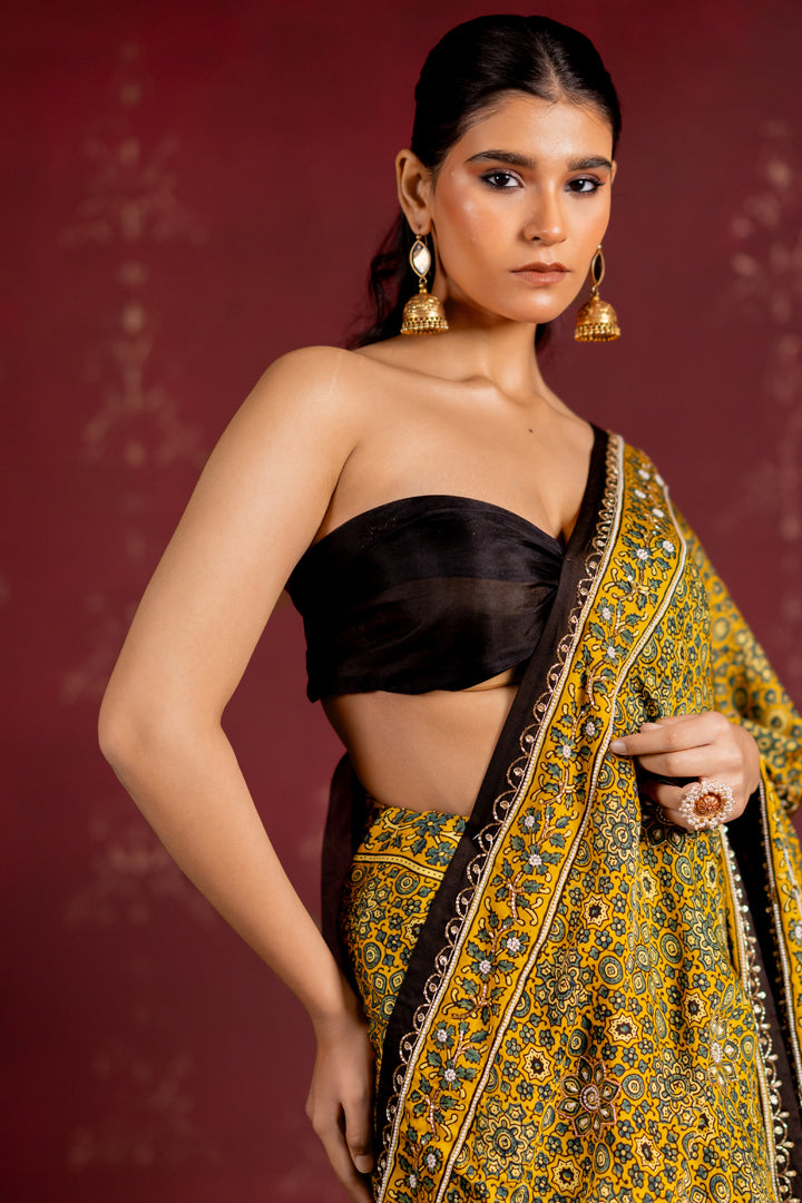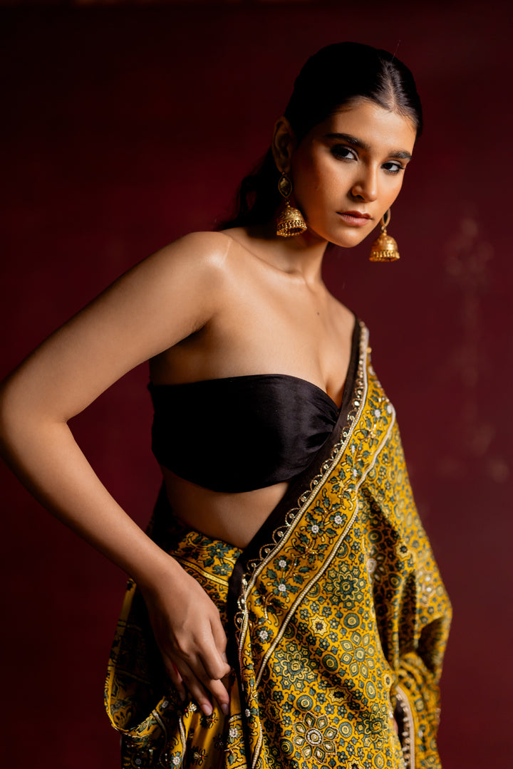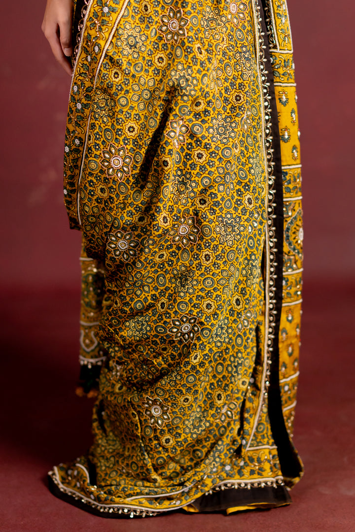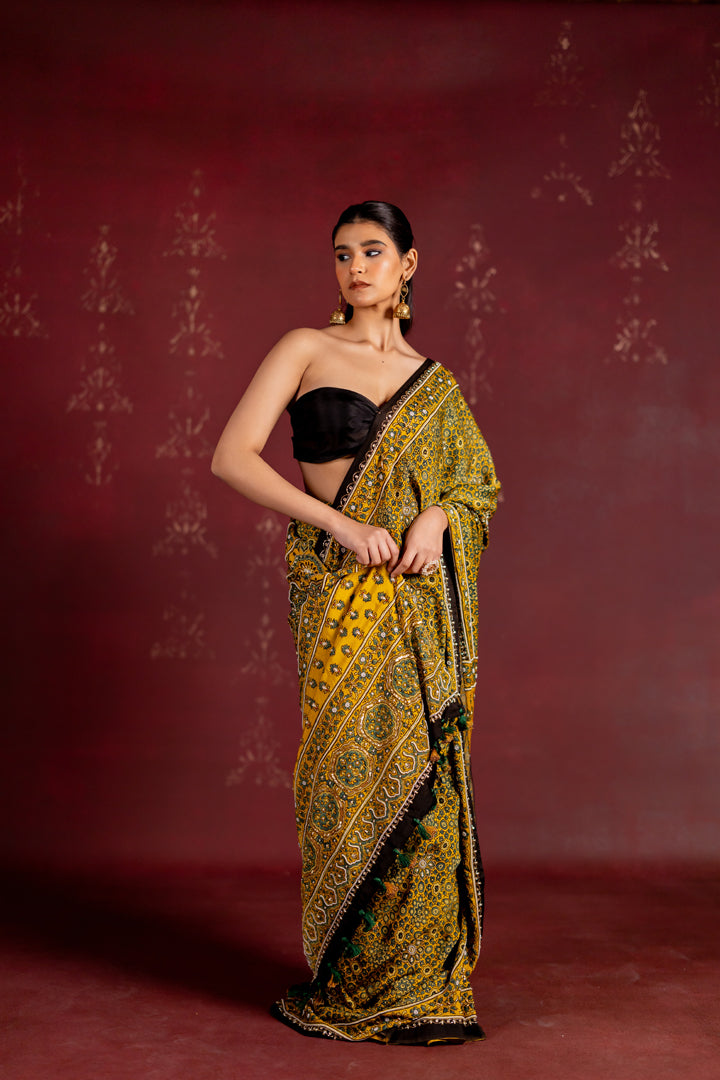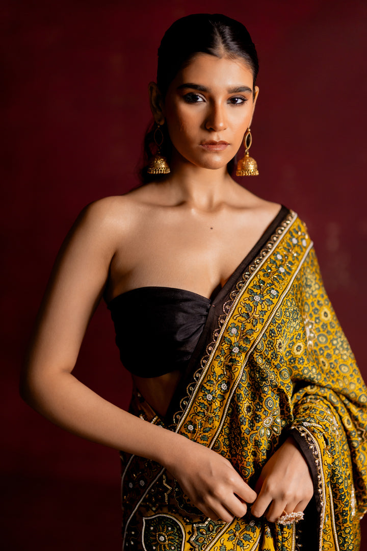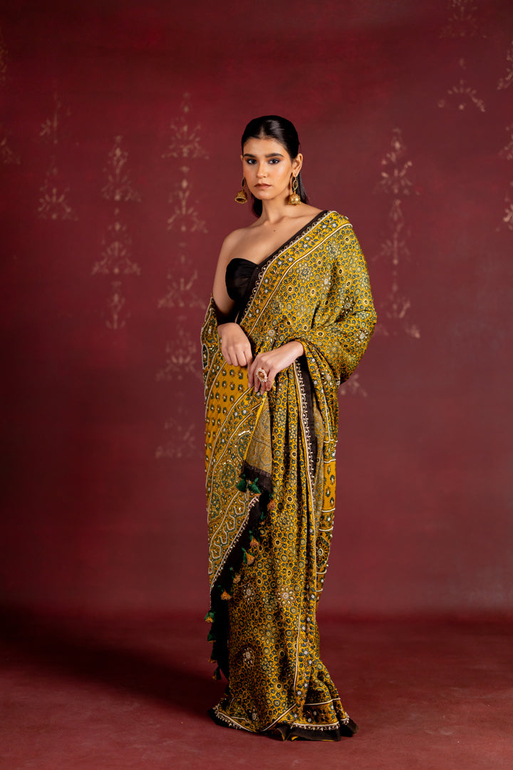 A limited edition Ajrakh saree crafted in luxurious modal silk, adorned with traditional hand block prints and delicate hand embroidery. Each piece is a true work of art, celebrating timeless heritage craftsmanship with a contemporary touch.