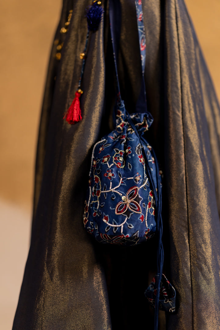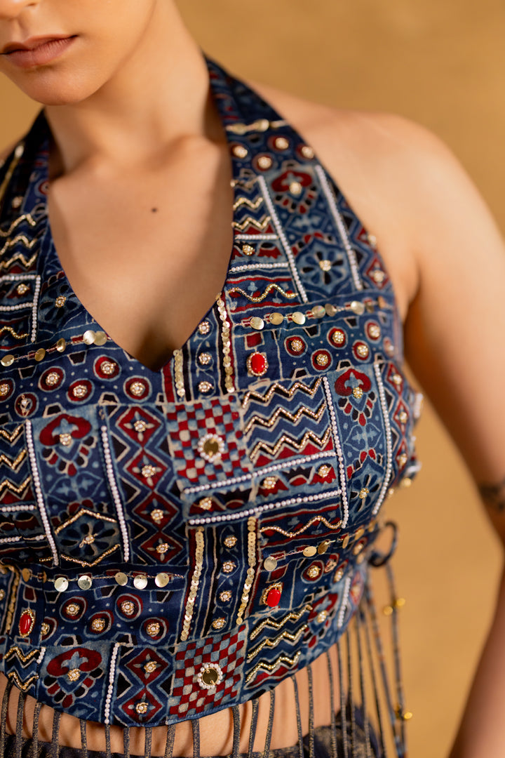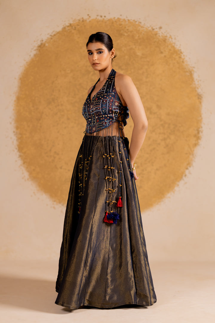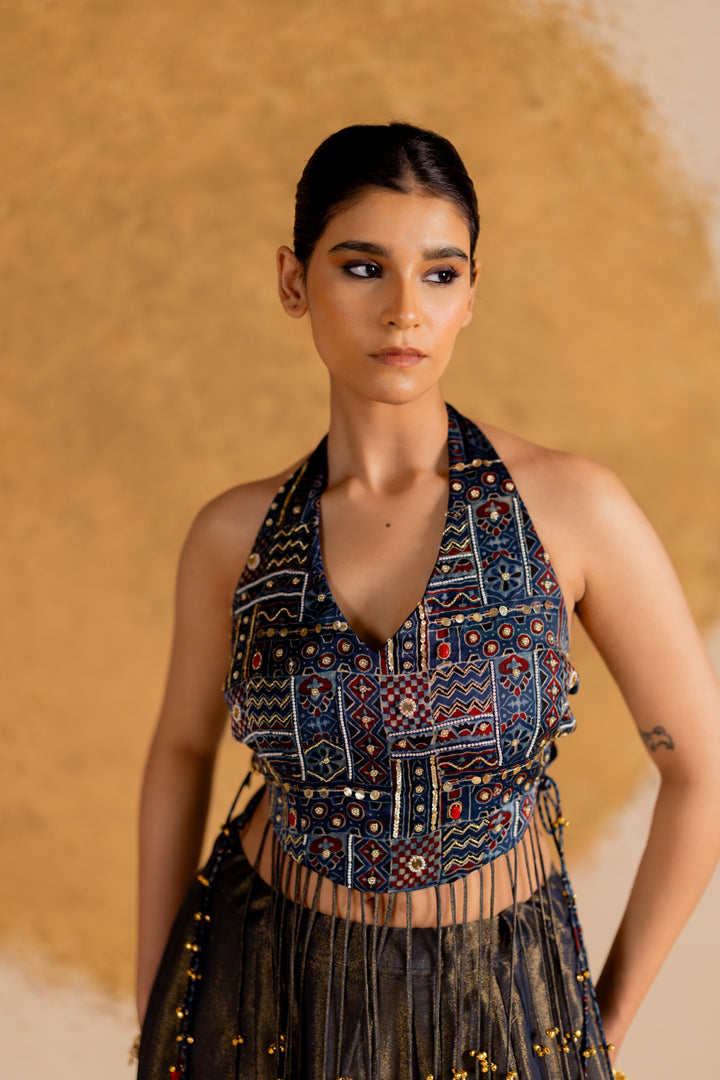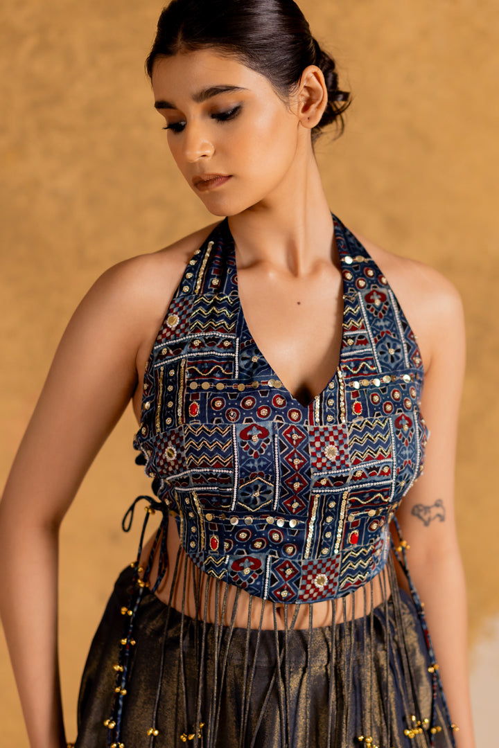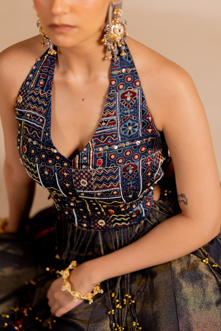 Boho Ajrakh Top with Tissue Lehenga Indigo Blue