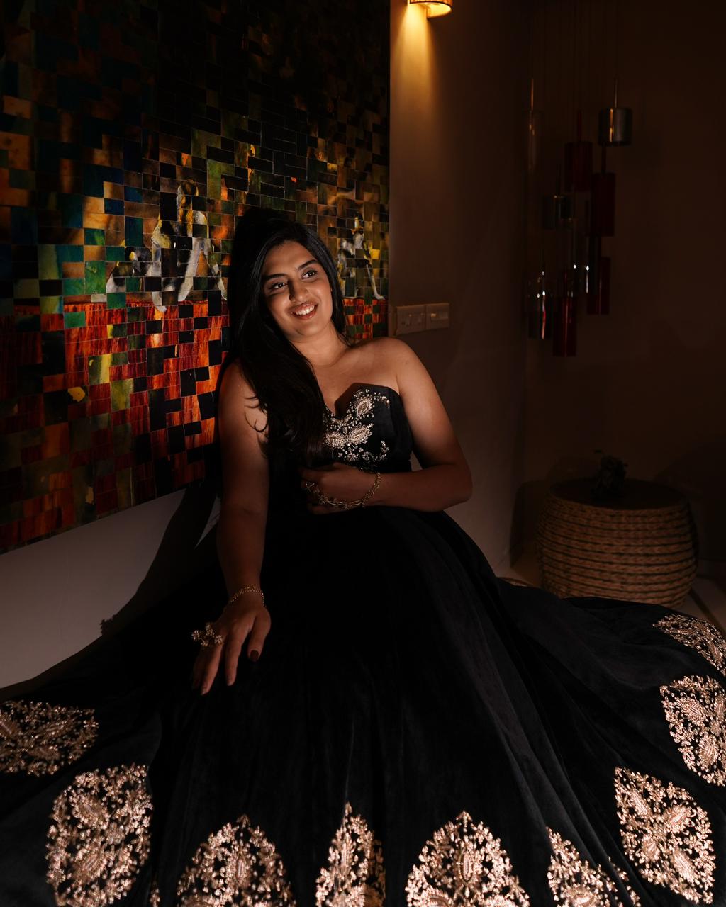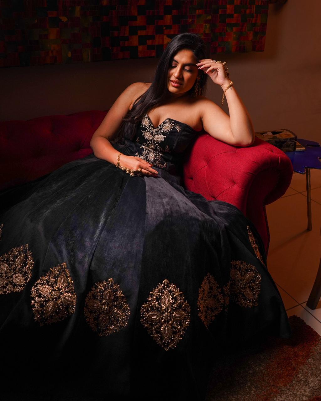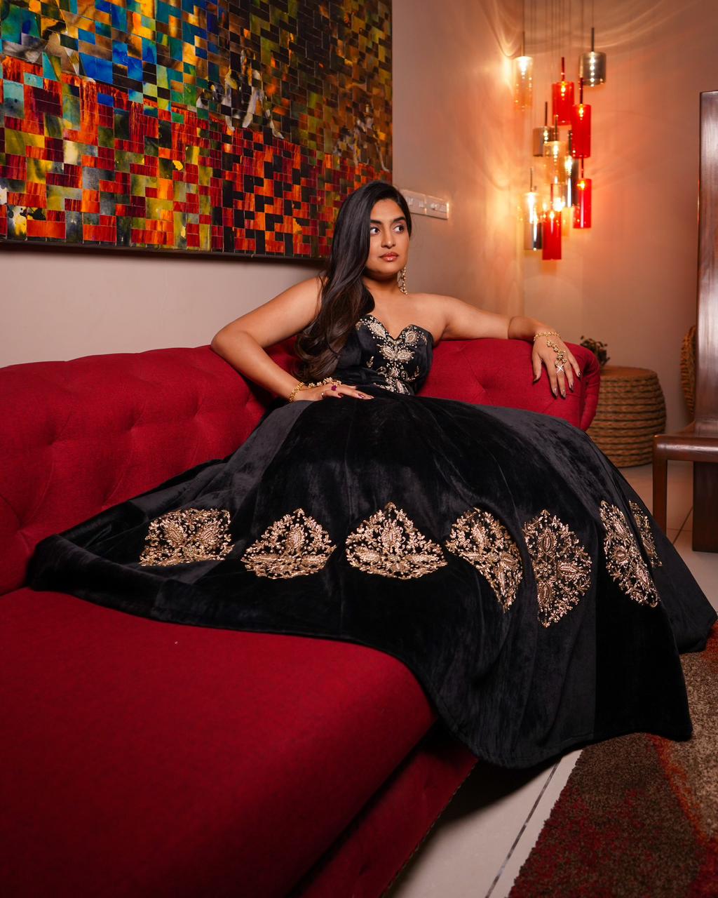 A stunning ensemble featuring an intricately embroidered corset paired with a mid-embroidered velvet lehenga. This set strikes the perfect balance between elegance and glamour, making it ideal for weddings, sangeets, or cocktail events.