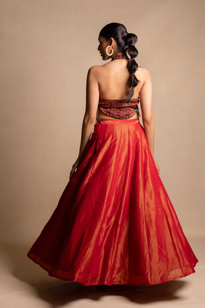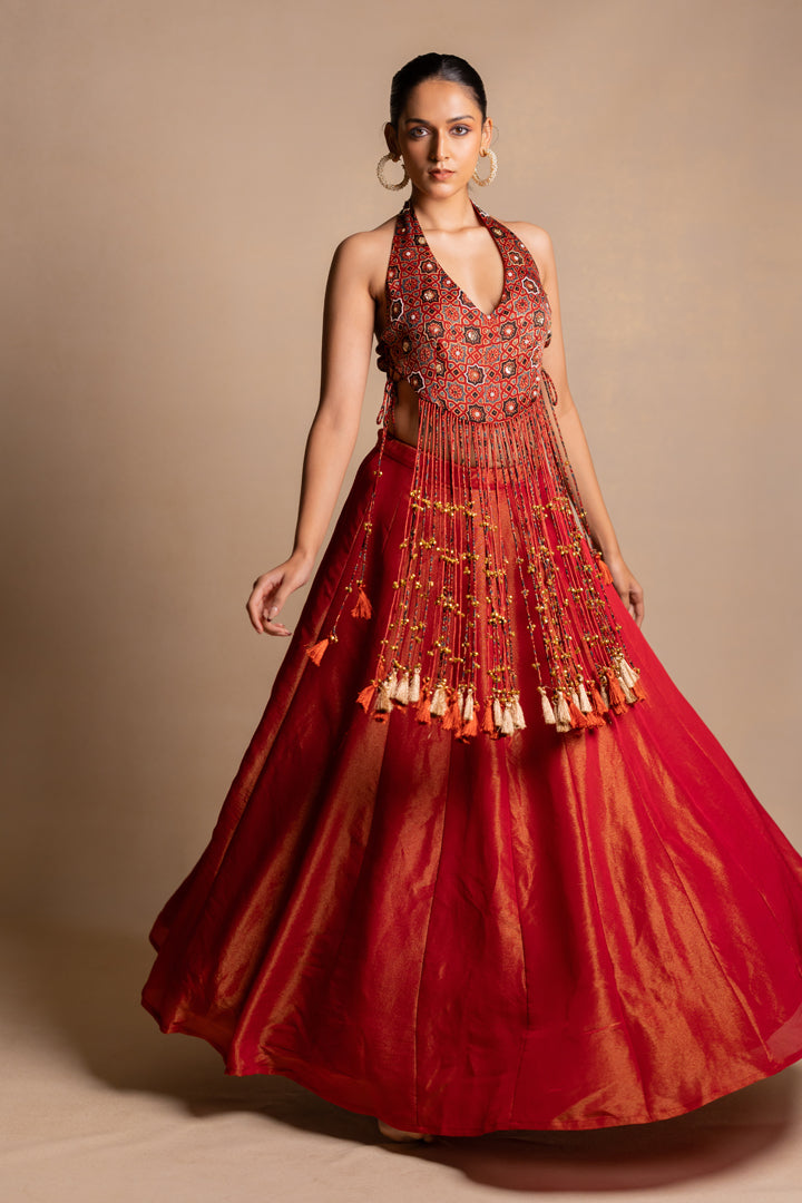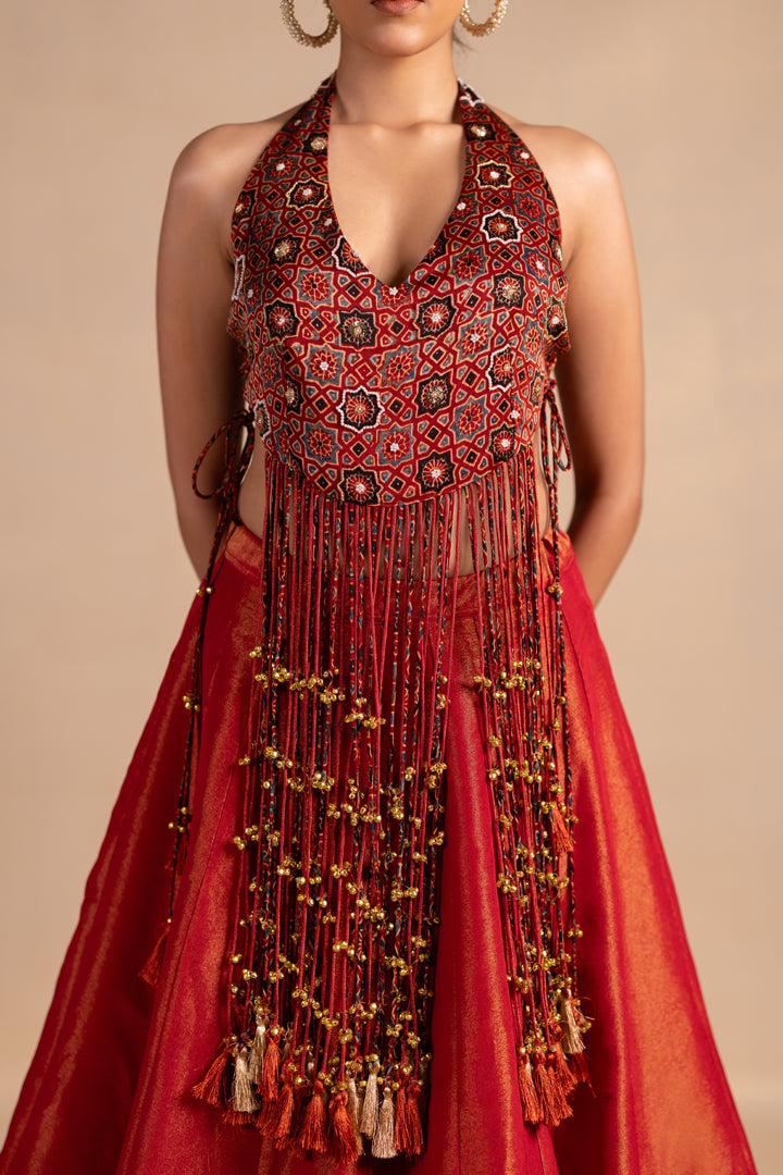 A beautifully crafted boho ensemble that brings together heritage prints and contemporary silhouettes. The flowy tissue lehenga adds a soft, luminous charm, paired with an Ajrakh top featuring intricate hand embroidery. Finished with playful tassel details and adjustable side drawstrings, this outfit is equal parts stylish and comfortable.